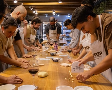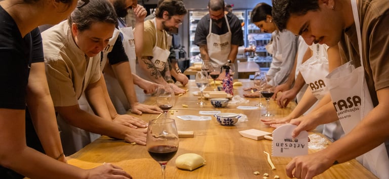 Workshop de massas artesanais 100% mão na massa. Nessa experiência, você se junta a um grupo de pessoas para viver um momento único ao redor da mesa. Vamos colocar a mão na massa, aprender os segredos das massas artesanais, degustar um bom vinho e trocar experiências enquanto fazemos massa juntos. Para fechar com chave de ouro, compartilhamos um jantar digno das verdadeiras casas italianas.